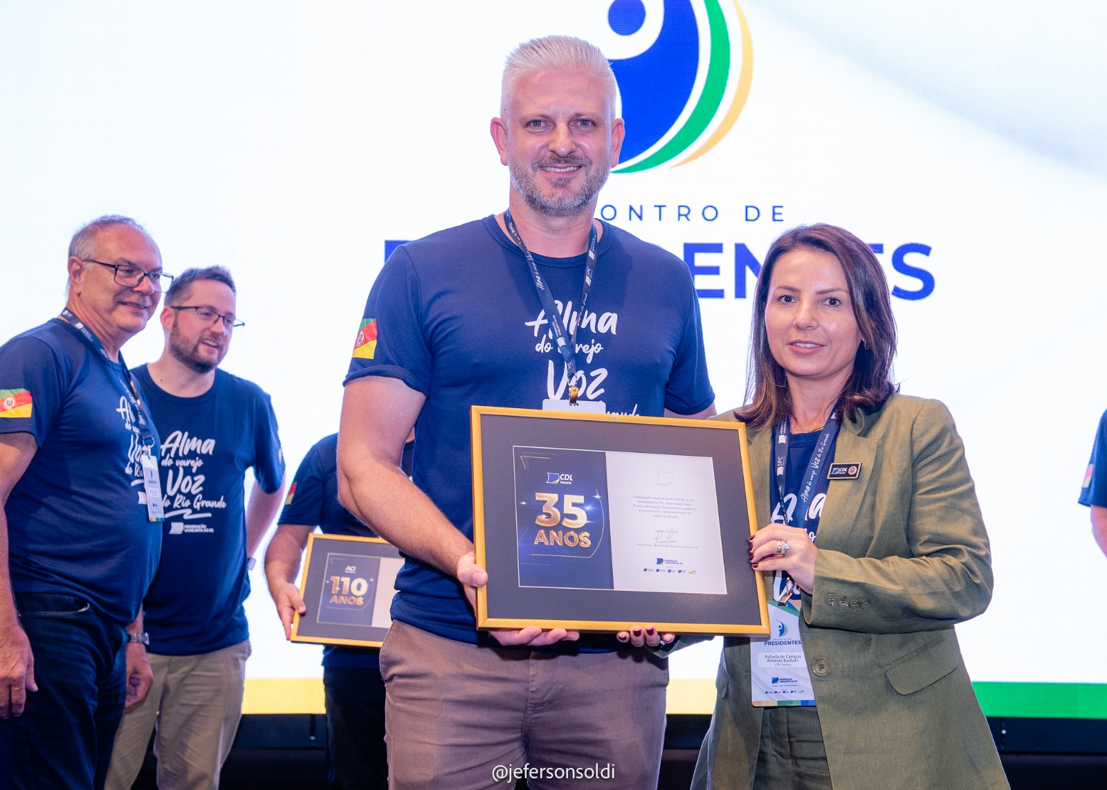 Durante o encontro, a CDL Vacaria também recebeu uma homenagem especial pelos seus 35 anos de atuação, sendo agraciada com uma placa comemorativa em reconhecimento à sua trajetória e contribuição para o fortalecimento do comércio local e do associativismo.